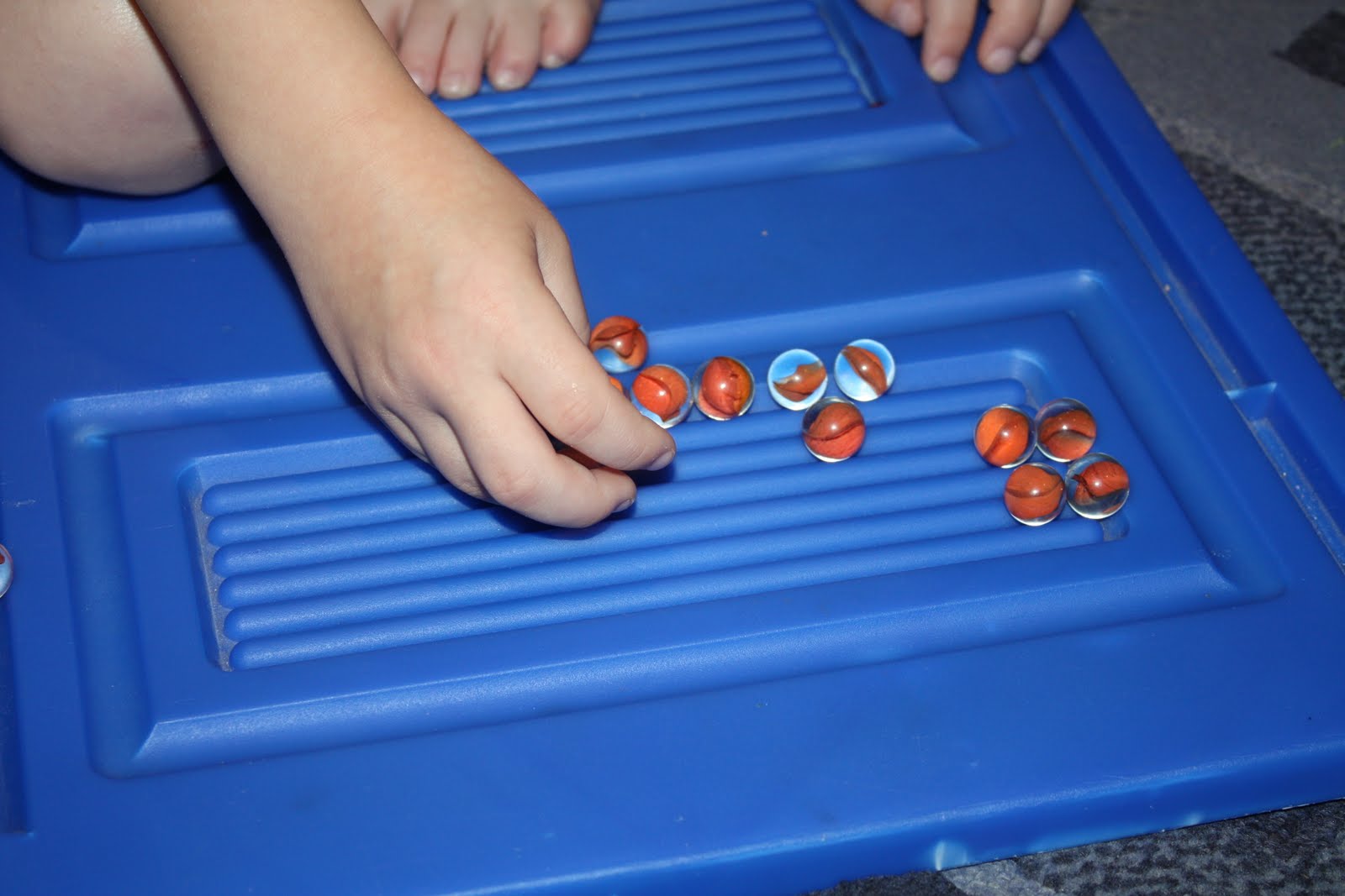 We found a bag of marbles at ToysRUs for only $1.00. I bought the marble game at the consignment sale a while back but there were no marbles, so the boys were so excited to actually have marbles.